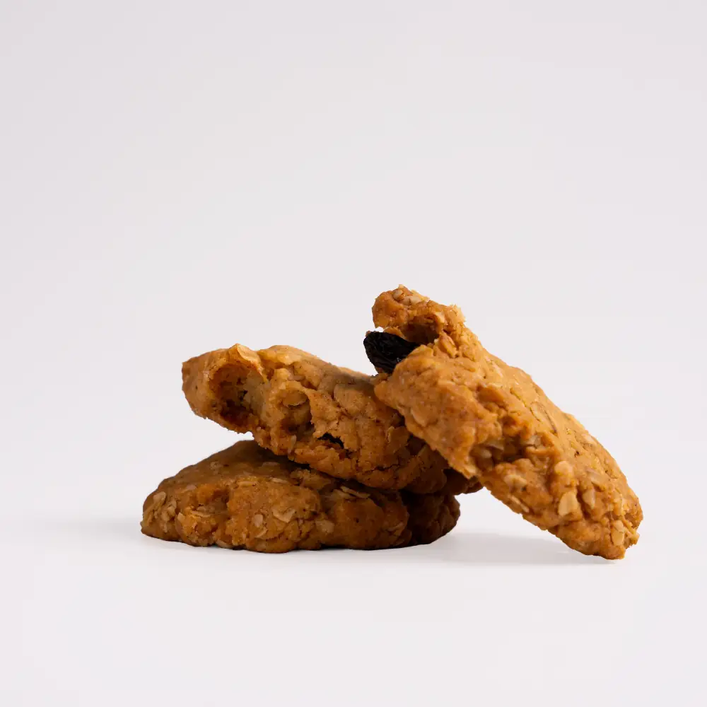 A chewy, hearty cookie packed with rolled oats and sweet raisins. Rich in fibre and flavour. Perfect with your morning coffee or as a wholesome snack.