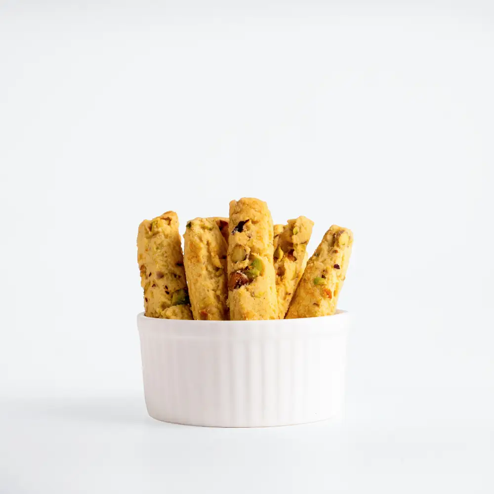 Long, buttery cookie sticks filled with crushed pistachios. Elegant, mildly sweet, and nutty. Perfect for tea-time.